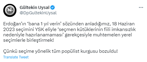 Uysal, Cumhurbaşkanı Erdoğan'ı seçim tarihi üzerinden hedef aldığı mesajında şu ifadeleri kullandı: