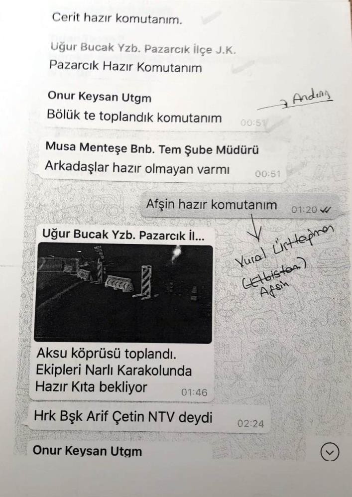 15 Temmuz'da hain darbe girişiminde "Kahramanmaraş İl Jandarma Komutanlığı"nda görevli rütbeli askerlerin oluşturdukları Whatsapp grubunda ilçe jandarma komutanlarına verilen hazırlık talimatları ve yazışmaları ortaya çıktı.