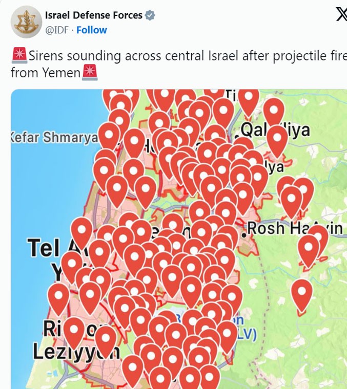 İsrail ordusu, Pazartesi günü resmi X hesabından yaptığı bir paylaşımda Yemen'den fırlatılan füzeler sonrası ülkenin orta kesimlerinde sirenlerin çaldığını belirtti.
