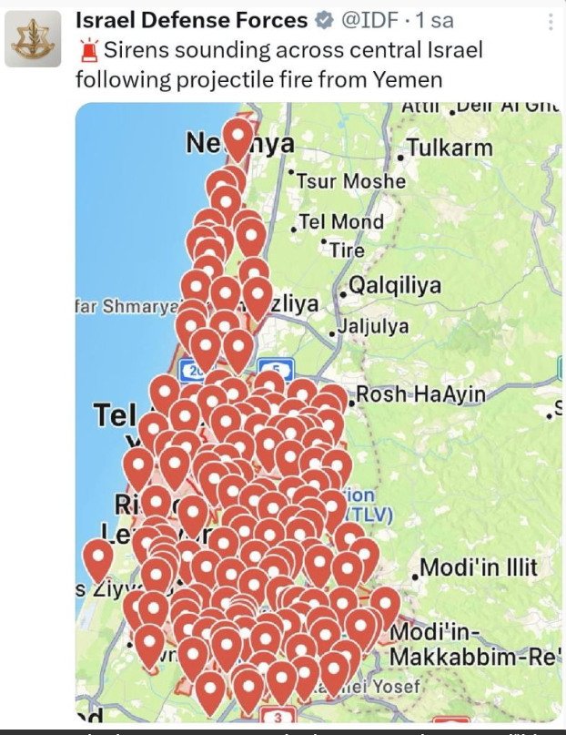 Yemen'den İsrail’e bir misilleme saldırısı daha gerçekleştirildi. İsrail Savunma Kuvvetleri’nden (IDF) yapılan açıklamada, Yemen'den fırlatılan bir füze nedeniyle ülkenin birçok bölgesinde sirenlerin çaldığı bildirildi.