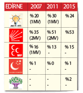 YILLAR yılı sağ partilerin yok sayıldığı Trakya’da ve özellikle Edirne’de AK Parti oylarını bir miktar yükseltecek gibi duruyor. MHP’de ise, küçük bir düşüş olmakla birlikte milletvekili dağılımı 7 Haziran’la aynı görülüyor.