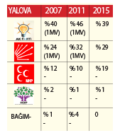 Yalova 2 vekil sayısını 1 – 1 CHP ile AK Parti arasında paylaşmaktadır. AK Parti’nin % 40’ları geçmeye çalıştığı Yalova’da, CHP de % 30 bandına yerleşme derdinde…