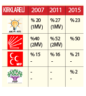 KIRKLARELİ’DE son üç seçim üzerinde yaptığımız analiz ve sahada gördüklerimiz, sürpriz sonuç çıkması muhtemel illerden biri olarak dikkatimizi çekmektedir. Bu sürpriz, Kırklareli seçmeninin yaklaşık yarısının oyunu alan CHP açısından değil, her ikisi birbirine çok yakın oy alan MHP ve AK Parti arasında yaşanıyor.