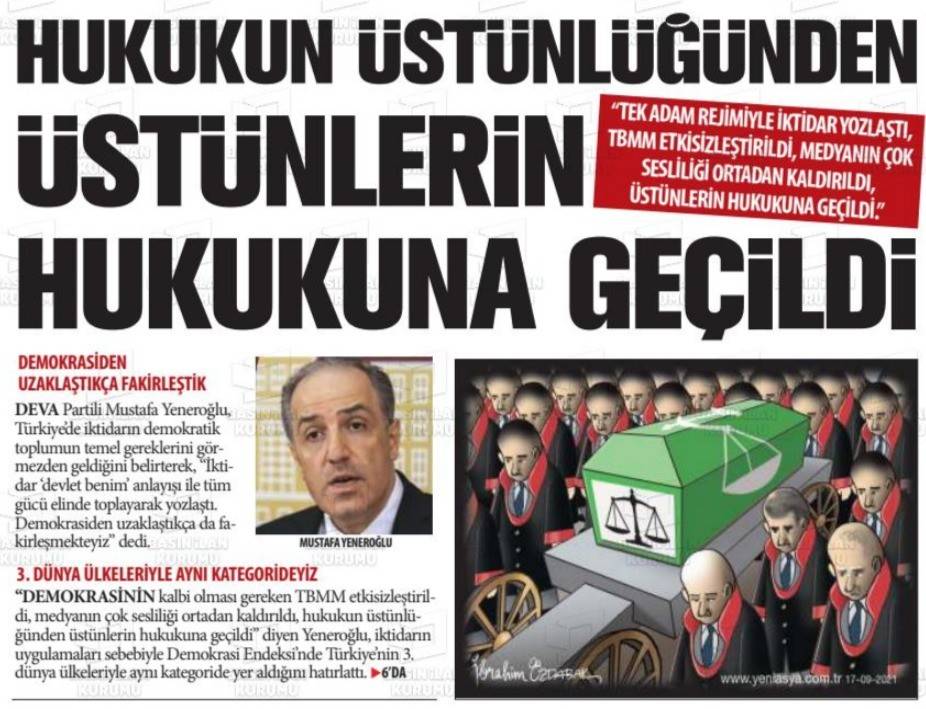 Yeni Asya manşetinde, “Hukukun üstünlüğünden, üstünlerin hukukuna geçildi” sözleri ile bugünkü Erdoğan dönemini eleştirdi. Bu manşetiyle gazete, Menderes'in idam edildiği dönemi, “Hukukun üstün tutulduğu dönem” olarak göstermiş oldu.