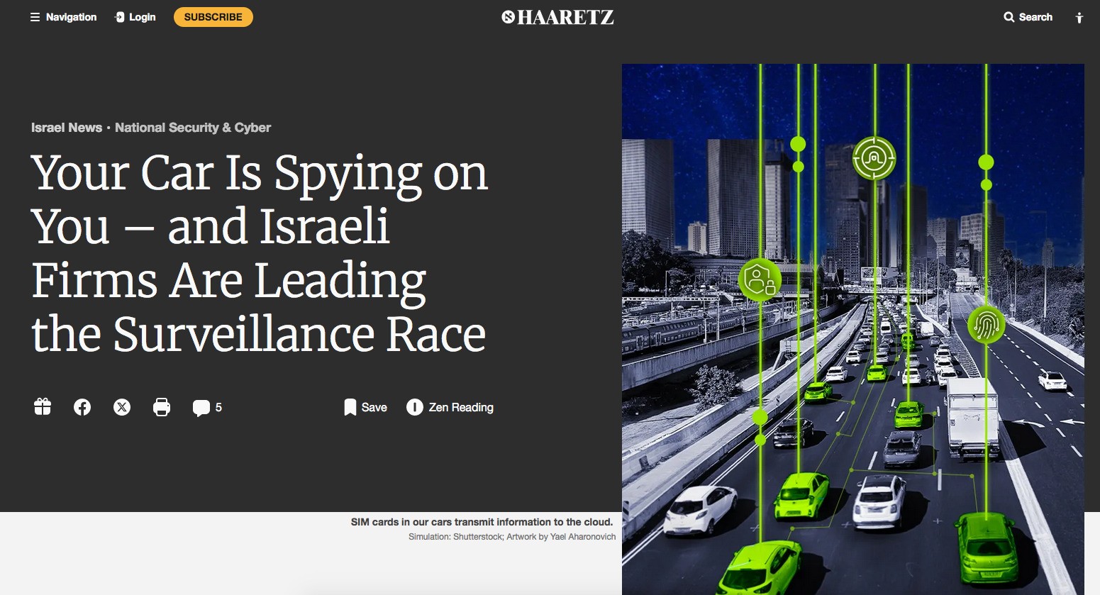 Yahudi Haaretz’in haberine göre; İsrailli şirketler, araçların dijital altyapısına sızarak kullanıcılar hakkında istihbarat toplayabilen gelişmiş siber araçlar geliştiriyor ve satıyor. Bu sistemler, yollardaki on binlerce araç arasından belirli bir hedefi tespit etmek için farklı veri kaynaklarını çapraz eşleştirebiliyor. Habere göre bu şirketler, araçlardaki mikrofon ve kameralara sızabilecek yazılımlar geliştirdi.