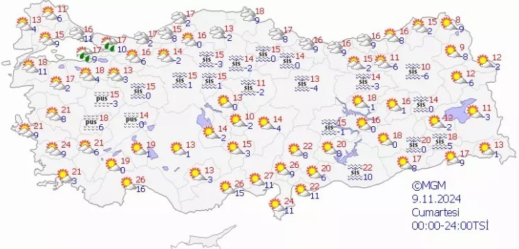 Meteoroloji Genel Müdürlüğü tarafından yapılan son tahminlere göre, ülkemizin kuzey ve iç kesimlerinin parçalı ve yer yer çok bulutlu, İstanbul, Kocaeli ve Yalova çevreleri ile Kırklareli'nin kıyı, Balıkesir’in kuzey kesimlerinin yağmur ve sağanak yağışlı, diğer yerlerin az bulutlu ve açık geçeceği tahmin ediliyor. Kuzey ve iç kesimlerde pus ve yer yer sis hadisesi görülmesi bekleniyor.