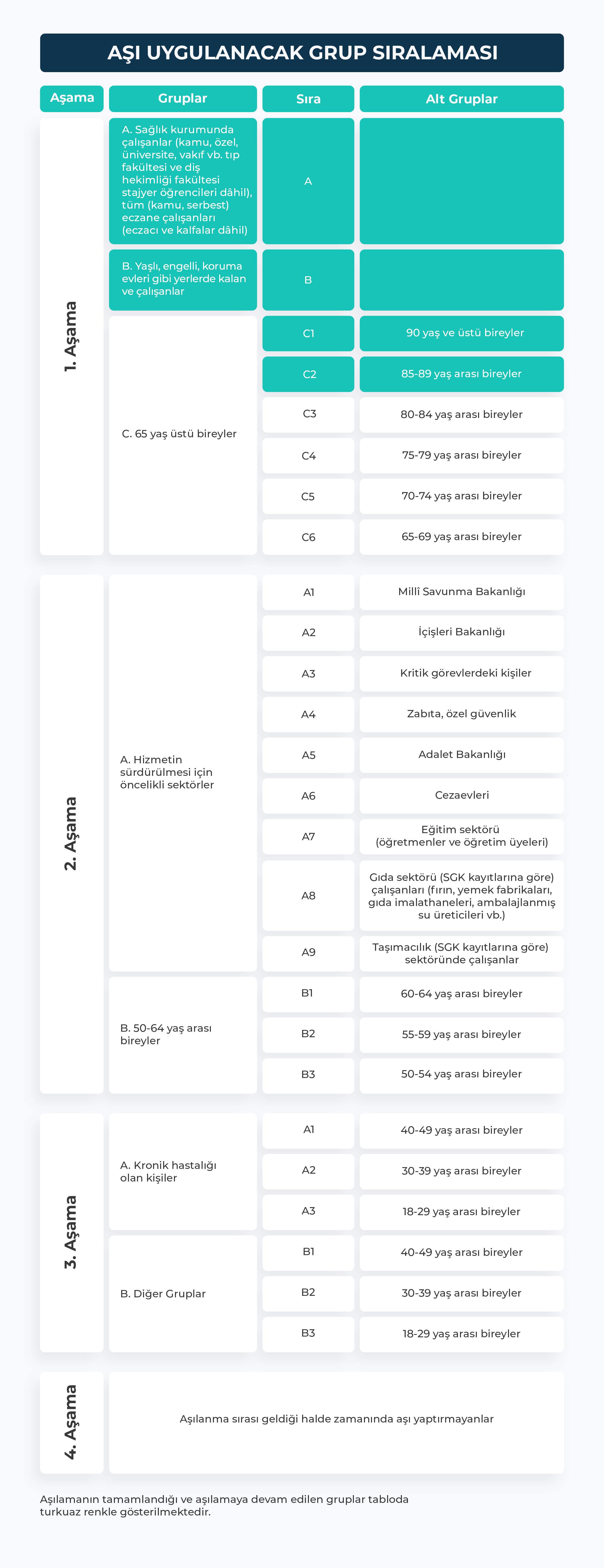 Hastalığa maruz kalma, hastalığı ağır geçirme ve bulaştırma riskleri ile hastalığın toplumsal yaşamın işleyişi üzerindeki olumsuz etkisi değerlendirilerek COVID-19 aşısı uygulanacak gruplar belirlenmiş olup bu gruplara sırasıyla uygulanacaktır.