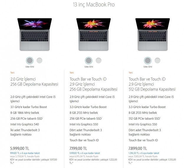 13 inç modeller arasında en üst seviye olan MacBook Pro modeli ise Touch Bar ve Touch ID teknolojilerini barındırırken 2.9 GHz işlemci ile 512 GB depolama kapasitesine sahip. Bu üründe ise 7 bin 899 TL’lik fiyat etiketi bulunuyor.