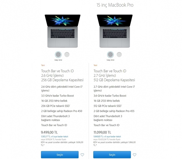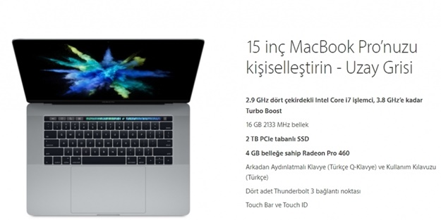 Gelelim, 15 inç ekran boyutuna sahip olan MacBook Pro dizüstü bilgisayarlara. Burada ise iki seçenek sunuluyor. Her iki model de yine Touch Bar ve Touch ID teknolojilerine sahip durumda. 2.6 GHz işlemci ve 256 GB depolama kapasitesi olan model 9 bin 499 TL iken, 2.7 GHz işlemci ve 512 GB depolama kapasitesi sunan model 11 bin 99 TL’lik fiyata sahip. Peki, en üst modeli kişiselleştirirseniz?