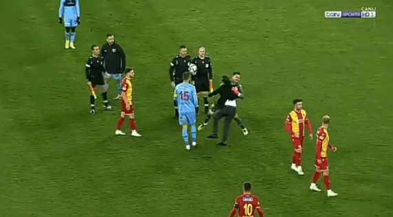 Maçın ardından sahaya giren Malatyaspor Başkanı Adil Gevrek, hakemlerin üzerine yürüdü. Hakemler, çevik kuvvet koridorunda sahada bekliyor.