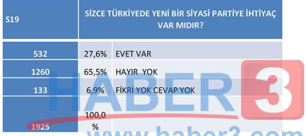 Araştırma şirketi, vatandaşlara 'Sizce Türkiye'de yeni bir siyasi partiye ihtiyacı var mıdır?' diye sordu. Ankete katılanların yüzde 65,5 hayır yok, yüzde 27,6'sı evet var, yüzde 6,9'luk kısmı ise 'fikrim yok' cevabını verdi.