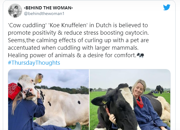 Hollanda'da insanlar çiftliklere akın etmeye başladı. Nedeni ise yeni gelişen ve tüm dünyaya yayılmaya başlayan bir sağlıklı yaşam trendi. "Koe knuffelen" yani "inek kucaklama" denilen bu yöntemde, insanlar çiftliklerde ineklerle vakit geçiriyor ve ineklerin sıcaklıkları ve boyutları sayesinde streslerinin azaldığı ve mutluluk hormonu olan oksitosin salgılandığı ileri sürülüyor.