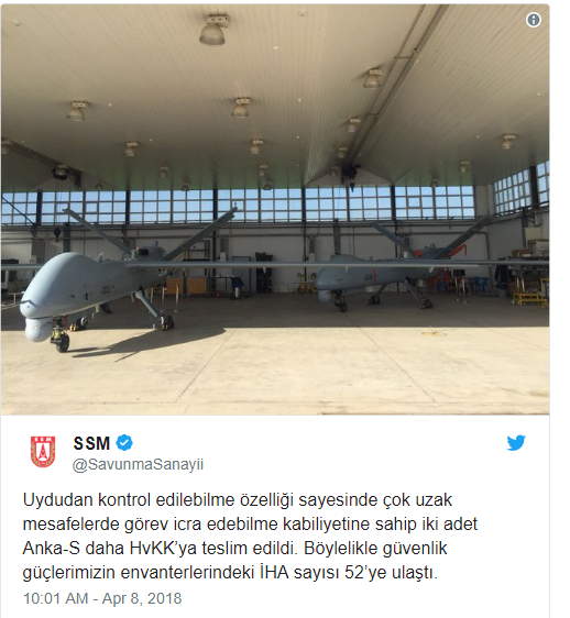 İHA'ların teslimatını Savunma Sanayii Müsteşarlığı sosyal medya hesabından yaptığı paylaşımla duyurdu. Açıklamada, ''Uydudan kontrol edilebilme özelliği sayesinde çok uzak mesafelerde görev icra edebilme kabiliyetine sahip iki adet Anka-S daha HvKK’ya teslim edildi. Böylelikle güvenlik güçlerimizin envanterlerindeki İHA sayısı 52’ye ulaştı.” bilgisine yer verildi.