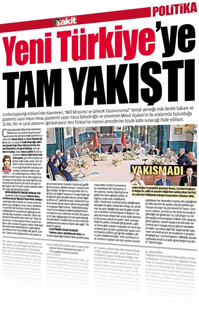 FARUK ARSLAN / İSTANBUL - Cumhurbaşkanlığı Külliyesi’nde düzenlenen “Millî Mirasımız ve Gelecek Tasavvurumuz” temasının ele alındığı yemeğe gazetemiz yazarlarından Hasan Aksay ve Yavuz Bahadıroğlu’nun yanı sıra yazarlar Kadir Mısıroğlu, Mehmet Şevket Eygi, İhsan Süreyya Sırma, Rasim Özdenören, Ertuğrul Düzdağ, sinemacı Mesut Uçakan, hattat Hasan Çelebi ile eski bakanlardan Hasan Celal Güzel, Vehbi Dinçerler gibi millî ve manevi değerlere bağlı isimler katıldı. Yeni Türkiye’nin manevi iklimine büyük katkı sunacağı öngörülen buluşmayı yorumlayan uzmanlar milletin seçtiği cumhurbaşkanının milletin zihin, gönül ve manevi yapısını temsil eden kişilerle aynı masaya oturup kadim sorunlarla ilgili fikir alışverişinde bulunmasının çok faydalı sonuçlar doğuracağı ve Yeni Türkiye’yi manevi anlamda daha ileri taşıyacağı görüşünde birleşti.