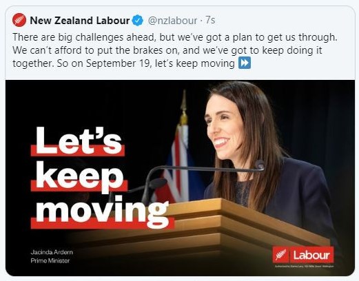 Pandemideki hızlı kararlarıyla ülkesinin geleceğini belirleyen genç başbakan Jacinda Ardern, Cumhurbaşkanı Erdoğan'ı örnek aldı. Kampanya sloganı olarak Erdoğan'ın meydanlarda sıkça kullandığı "Durmak yok yola devam" sloganıyla birebir örtüşen "Let's keep mooving" sloganını seçti.