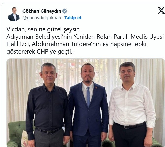CHP Grup Başkan Vekili Gökhan Günaydın, sosyal medya üzerinden yaptığı paylaşımda YRP’li Adıyaman Belediye Meclis Üyesi Halil İzci’nin partisinden istifa ederek CHP’ye geçtiğini duyurdu.
