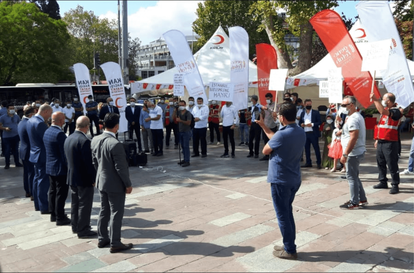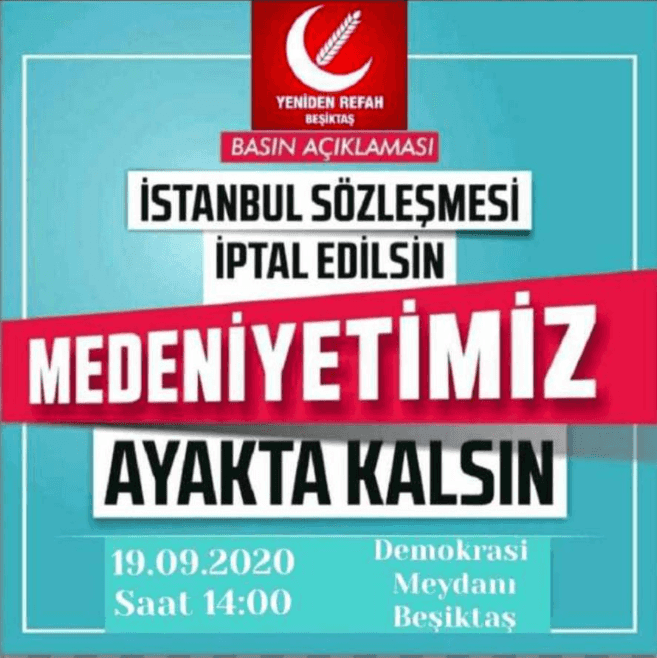 Yeniden Refah Partisi’nin eyleminde, “İstanbul Sözleşmesi’ne Hayır” , “Kadına Şiddet 4 kat arttı” , “Erkekler Evden Atıldı” , “Çocuklarımızın Suçu Ne?” ve “Bu Yasa Kimi Koruyor?” yazılı pankart ve dövizler açıldı.