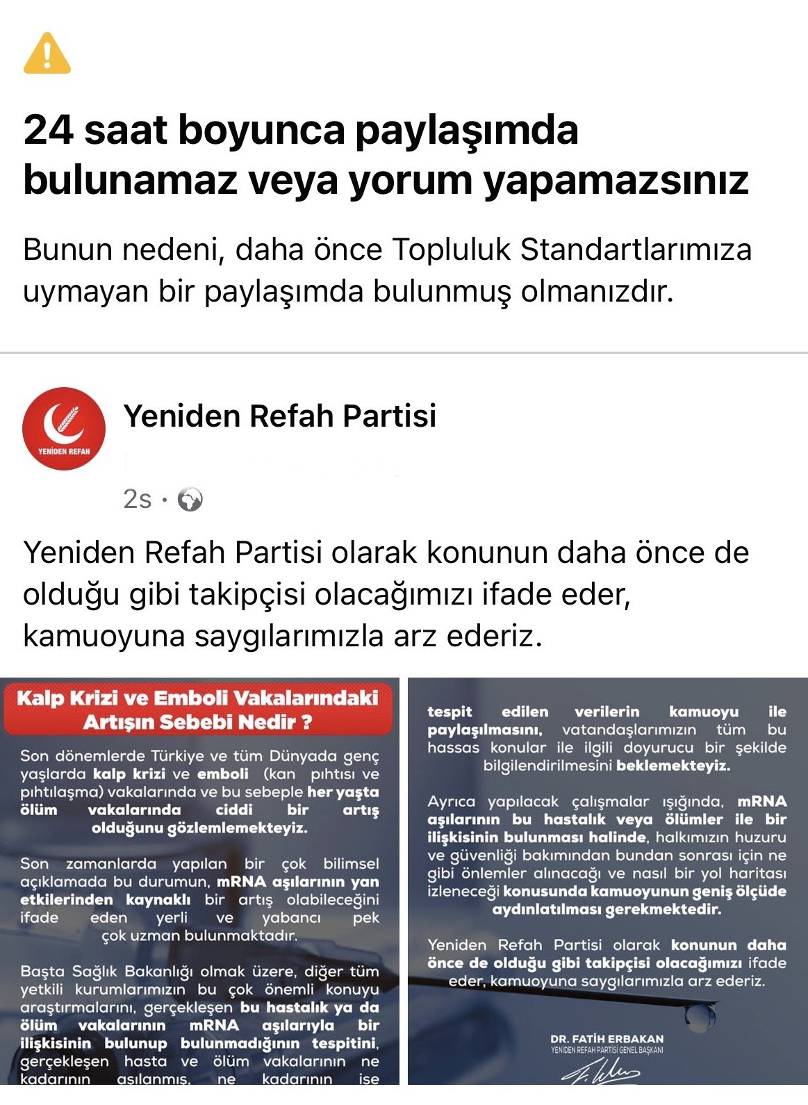 Yeniden Refah Partisi Genel Başkanı Fatih Erbakan'ın "Gençlerde kalp krizinden ölümlerdeki artışın sebebi mRNA aşıları mı?" açıklamasına ilişkin paylaşım, Facebook yönetimi tarafından engellendi. Facebook, partinin sayfasına kısıtlama getirdi.