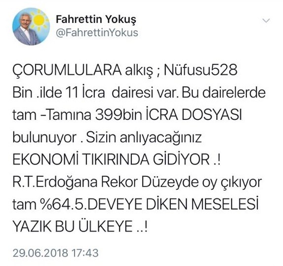 Yokuş, sosyal medya hesabından Çorum'daki yüzde 64,5 oy oranını paylaşarak seçmene küfür etti. Yokuş, paylaşımında "ÇORUMLULARA alkış; Nüfusu 528 Bin. İlde 11 İcra dairesi var. Bu dairelerde tam - Tamına 399 bin İCRA DOSYASI bulunuyor . Sizin anlıyacağınız EKONOMİ TIKIRINDA GİDİYOR .! R.T.Erdoğan'a Rekor Düzeyde oy çıkıyor tam %64.5. DEVEYE DİKEN MESELESİ YAZIK BU ÜLKEYE ..!" ifadelerini kullandı.