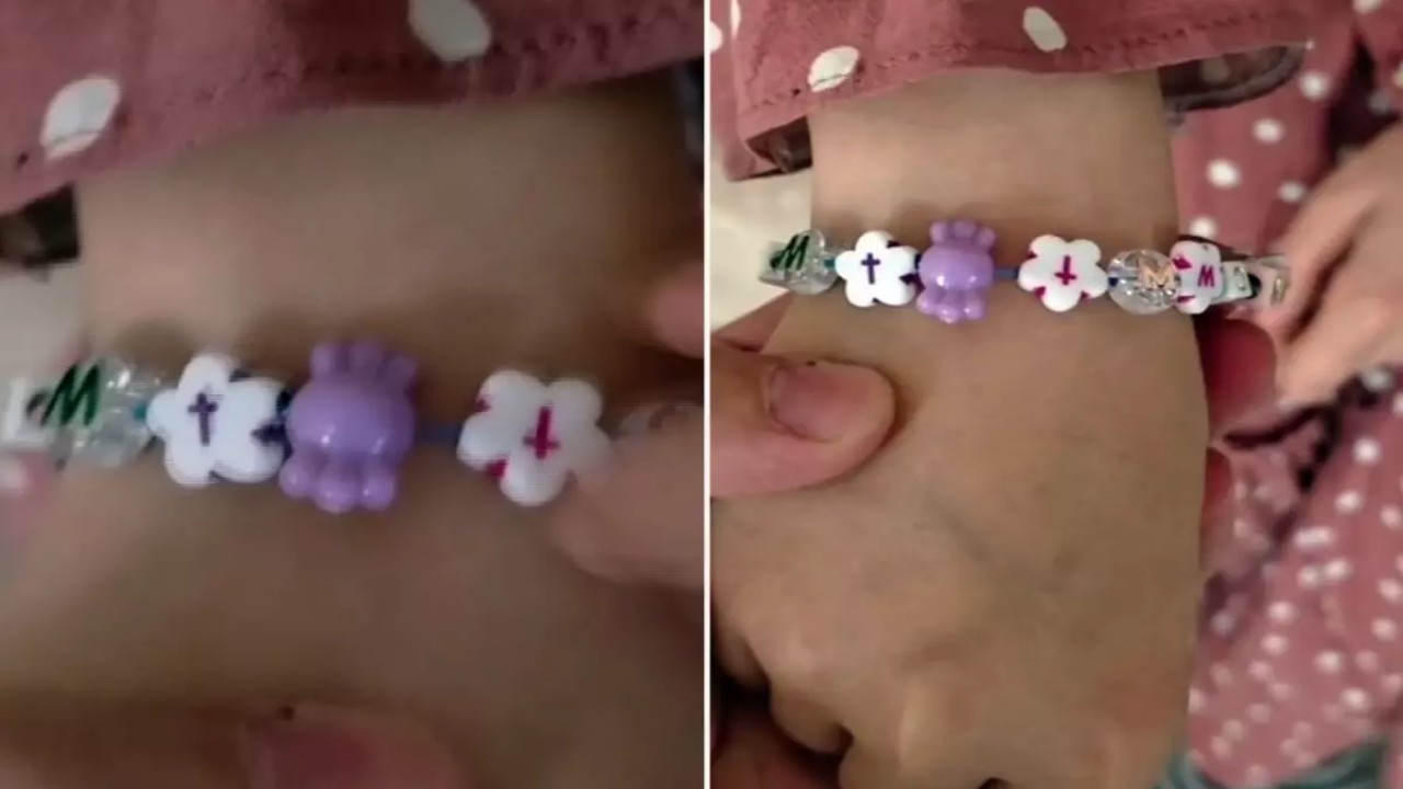Bileklik üzerindeki boncukları inceleyen baba, boncuklarda haç işareti olduğunu fark edince duruma tepki gösterdi ve o anları cep telefonu kamerasıyla kaydetti. Görüntülerde küçük kızın kolundaki bileklikte haç işaretleri olduğu görülüyor.