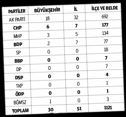 2014 Yerel Seçimleri’nde Türkiye genelinde yüzde 45’in üzerinde oy alarak birinci parti çıkan AK Parti, 30 büyükşehirin 18’inde birinci parti olmayı başardı. AK Parti; İstanbul, Ankara, Antalya, Bursa, Gaziantep, Kocaeli, Balıkesir, Denizli, Erzurum, Kahramanmaraş. Kayseri, Konya, Malatya, Ordu, Sakarya, Şanlıurfa, Samsun ve Trabzon büyükşehirlerinde zafere ulaştı. Kalan 12 büyükşehirin 6’sını CHP, 3’ünü MHP, 2’sini de BDP aldı. Mardin’den bağımsız olarak seçimlere giren Ahmet Türk de Mardin Büyükşehir Belediye Başkanı oldu. Büyükşehirlerdeki başarısını illerde de sürdüren AK Parti, 51 ilin 32’sini kazandı. AK Parti’yi 7’şer ille CHP ve BDP, 5 ille de MHP takip etti. AK Parti, ilçe ve belde belediyelerinin ise neredeyse yüzde 60’tan fazlasını alarak büyük bir rekora imza attı.