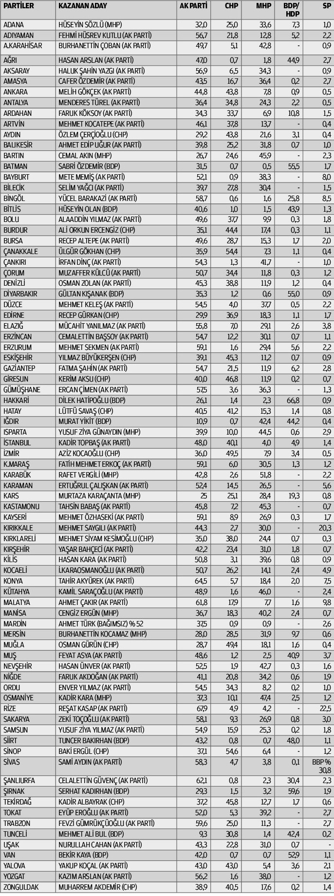 HABER MERKEZİ - Seçim sonuçlarına bakılacak olursa AK Parti tahminleri altüst ederek yüzde 45’i aştı. CHP ise büyük bir hayal kırıklığı yaşadı ve Türkiye genelinde yüzde 27’de kaldı. MHP’nin oyları Türkiye genelinde yüzde 15 civarında olurken, BDP Türkiye genelinde yüzde 4 oy aldı.