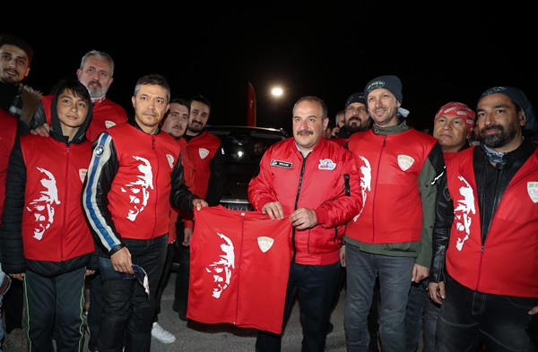 Motosikletçiler, Bakan Varank'a, üzerinde Mustafa Kemal ve Türk bayrağı bulunan kırmızı bir motorcu yeleği hediye etti.