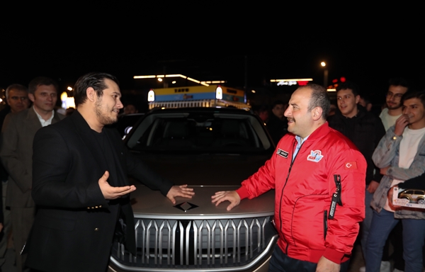 Varank, daha sonra havalimanında bulunan motor sporları tutkunlarına "Togg ile patinaj yapalım mı deneyelim mi sizce?" diye sordu.