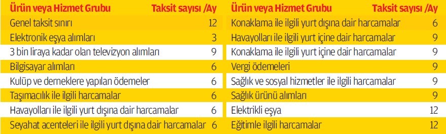 Banka kartları ve kredi kartları hakkındaki yönetmelik kapsamında, ürün veya hizmet grubuna göre taksit sınırları şu şekilde belirlendi: