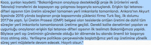Koronavirüsle mücadele kapsamında bir yandan yerli aşı çalışması son sürat devam ederken diğer yandan yerli aşı çalışmaları her alanda devam ediyor. Sağlık Bakanı Fahrettin Koca, “Yerelleşme ve millileşme politikası doğrultusunda Sağlık Bakanlığımızın desteğiyle 2015 yılından beri yürütülen çalışmalar ilk sonuçlarını verdi. Uluslararası standartlarda üretilen ilk yerli aşımız kullanıma hazır.” ifadesini kullandı.