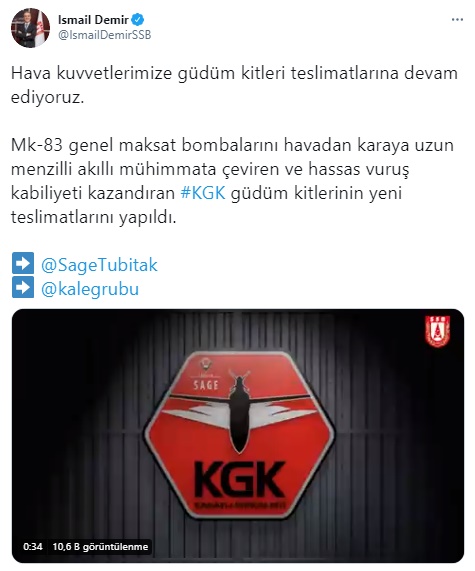 Savunma Sanayii Başkanı İsmail Demir, yaptığı paylaşımda "Hava kuvvetlerimize güdüm kitleri teslimatlarına devam ediyoruz. Mk-83 genel maksat bombalarını havadan karaya uzun menzilli akıllı mühimmata çeviren ve hassas vuruş kabiliyeti kazandıran #KGK güdüm kitlerinin yeni teslimatlarını yapıldı" ifadelerini kullandı.