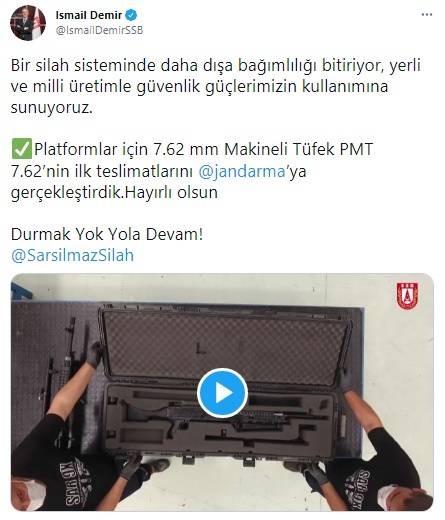 "Bir silah sisteminde daha dışa bağımlılığı bitiriyor, yerli ve milli üretimle güvenlik güçlerimizin kullanımına sunuyoruz. Platformlar için 7.62 mm Makineli Tüfek PMT 7.62'nin ilk teslimatlarını Jandarma Genel Komutanlığına gerçekleştirdik. Hayırlı olsun. Durmak Yok Yola Devam!"