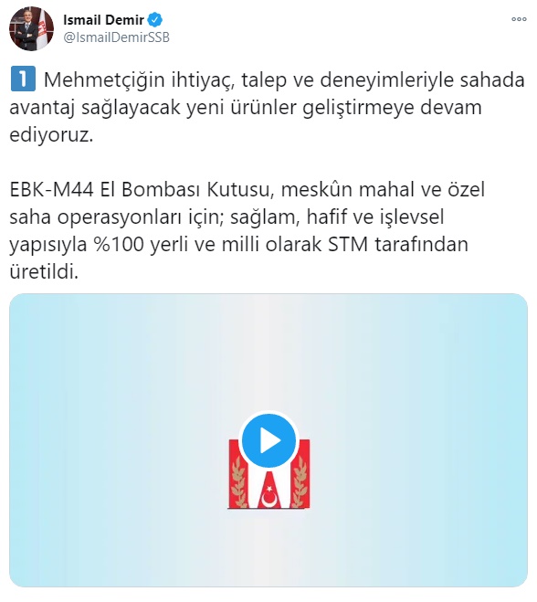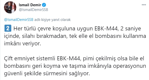 Demir, "EBK-M44 El Bombası Kutusu, meskûn mahal ve özel saha operasyonları için; sağlam, hafif ve işlevsel yapısıyla yüzde 100 yerli ve milli olarak STM tarafından üretildi. Her türlü çevre koşuluna uygun EBK-M44, 2 saniye içinde, silahı bırakmadan, tek elle el bombasını kullanma imkânı veriyor. Çift emniyet sistemli EBK-M44, pimi çekilmiş olsa bile el bombasını geri koyma ve taşıma imkânıyla operasyonun güvenli şekilde sürmesini sağlıyor. Kendisi küçük, etkisi ve faydası çok büyük olan EBK-M44, girdiği tüm zorlu testleri başarıyla tamamlayarak TSK’nın envanterine girmeye hazır hale geldi" ifadesini kullandı.
