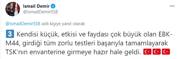 Cumhurbaşkanlığı Savunma Sanayii Başkanı İsmail Demir, Twitter hesabından yaptığı açıklamada, Mehmetçiğin ihtiyaç, talep ve deneyimleriyle sahada avantaj sağlayacak yeni ürünler geliştirmeye devam ettiklerini bildirdi.