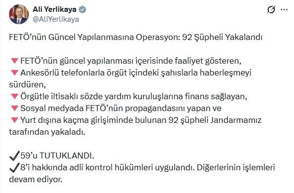 Yerlikaya, FETÖ’nün güncel yapılanmasına yönelik operasyonda 92 şüphelinin yakalandığını 59'unun ise tutuklandığını açıkladı.