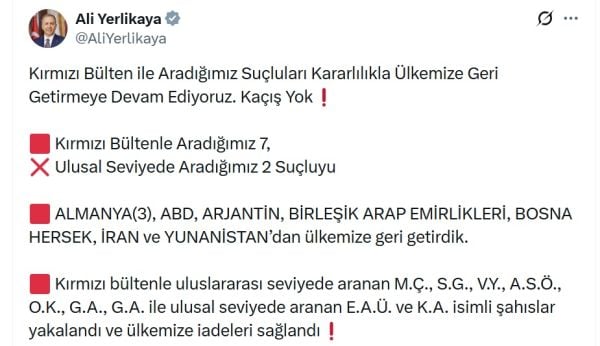 Bakan Yerlikaya, sosyal medya hesabından yaptığı açıklamada, "Kırmızı bültenle uluslararası seviyede aranan M.Ç., S.G., V.Y., A.S.Ö., O.K., G.A., G.A. ile ulusal seviyede aranan E.A.Ü. ve K.A. isimli şahıslar yakalandı ve ülkemize iadeleri sağlandı" dedi.