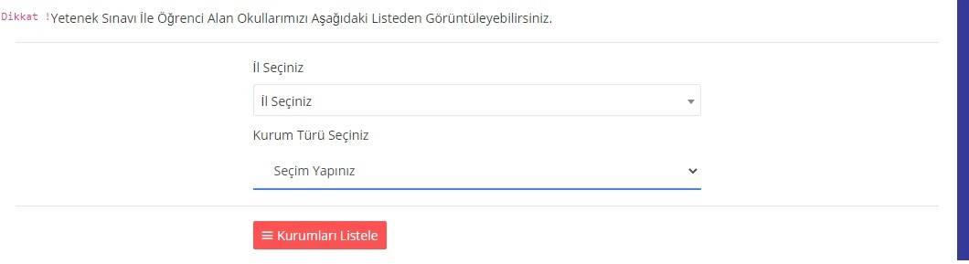 E okul üzerinden yetenek sınavıyla öğrenci alan okulların bilgileri paylaşıldı. İl, ilçe, kurum türünü seçtiğinizde yetenek sınavıyla öğrenci alan okullar ekranda sıralanacaktır.