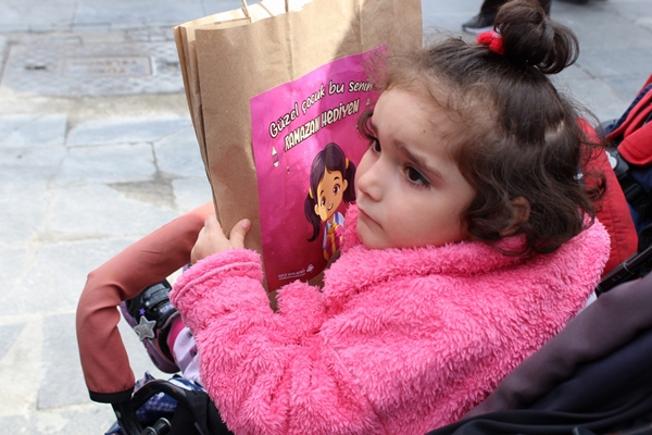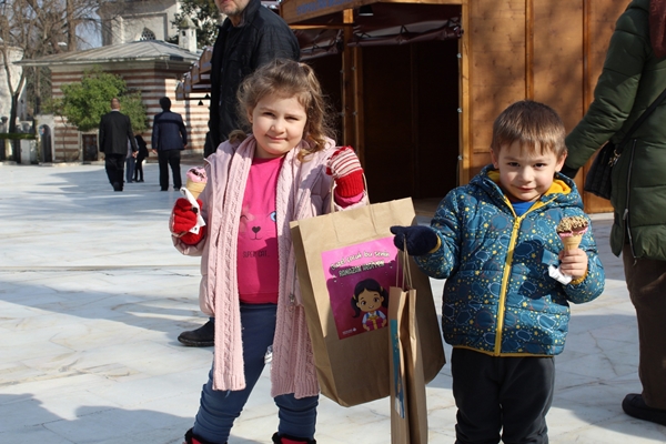 Nostaljik minibüsle Fatih, Kariye'de bulunan Yetim Vakfı Genel Merkezi’nden yola çıkan gönüllüler, Eyüpsultan'a geldi ve Eyüpsultan Camii önünde çocuklara içlerinde çeşitli hediyeler olan çantalar dağıttılar.