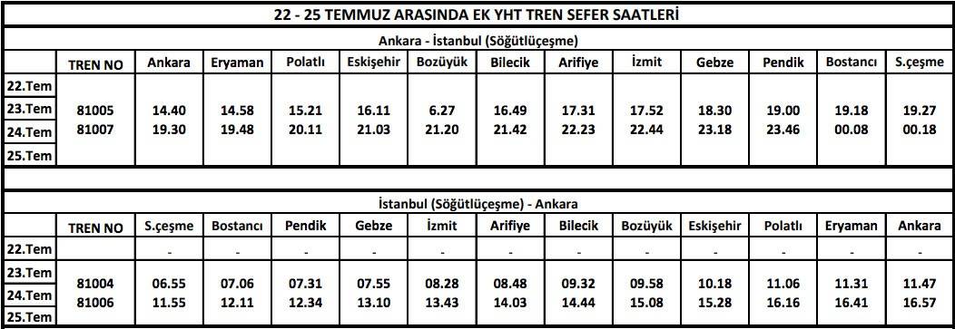 Söz konusu seferler, bugün Ankara'dan 14.40 ve 19.30'da, Konya'dan 15.45'te hareket edecek. 23-25 Temmuz'da ise Ankara-İstanbul (Söğütlüçeşme) arasında karşılıklı işleyecek YHT'ler, Ankara'dan 14.40 ve 19.30, İstanbul'dan (Söğütlüçeşme) 07.00 ve 12.00 saatlerinde hareket edecek. Konya-İstanbul (Söğütlüçeşme) seferinde ise yüksek hızlı tren, Konya'dan 15.45'te, İstanbul'dan (Söğütlüçeşme) ise 15.35'te hareket edecek. İlave yüksek hızlı trenlerle Kurban Bayramı süresince yaklaşık 11 bin kişilik ilave yolcu kapasitesi sağlanacak.