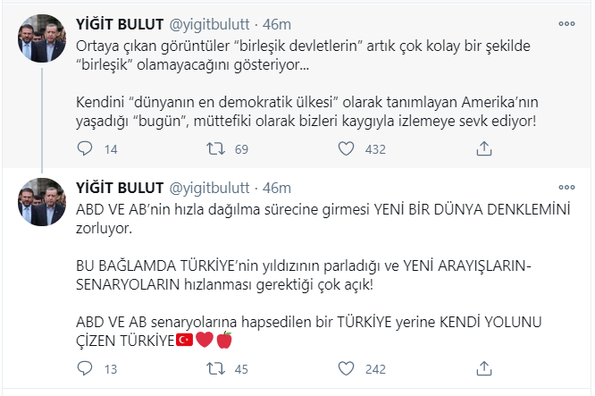 Konuyla ilgili olarak açıklamalarda bulunan Cumhurbaşkanı Başdanışmanı-Cumhurbaşkanlığı Ekonomi Politikaları Kurulu Üyesi Yiğit Bulut, “ABD VE AB’nin hızla dağılma sürecine girmesi yeni bir dünya denklemini zorluyor. Bu bağlamda Türkiye’nin yıldızının parladığı ve yeni arayışların-senaryoların hızlanması gerektiği çok açık! ABD VE AB senaryolarına hapsedilen bir Türkiye yerine kendi yolunu çizen Türkiye. Ortaya çıkan görüntüler “birleşik devletlerin” artık çok kolay bir şekilde “birleşik” olamayacağını gösteriyor... Kendini “dünyanın en demokratik ülkesi” olarak tanımlayan Amerika’nın yaşadığı “bugün”, müttefiki olarak bizleri kaygıyla izlemeye sevk ediyor!” dedi.