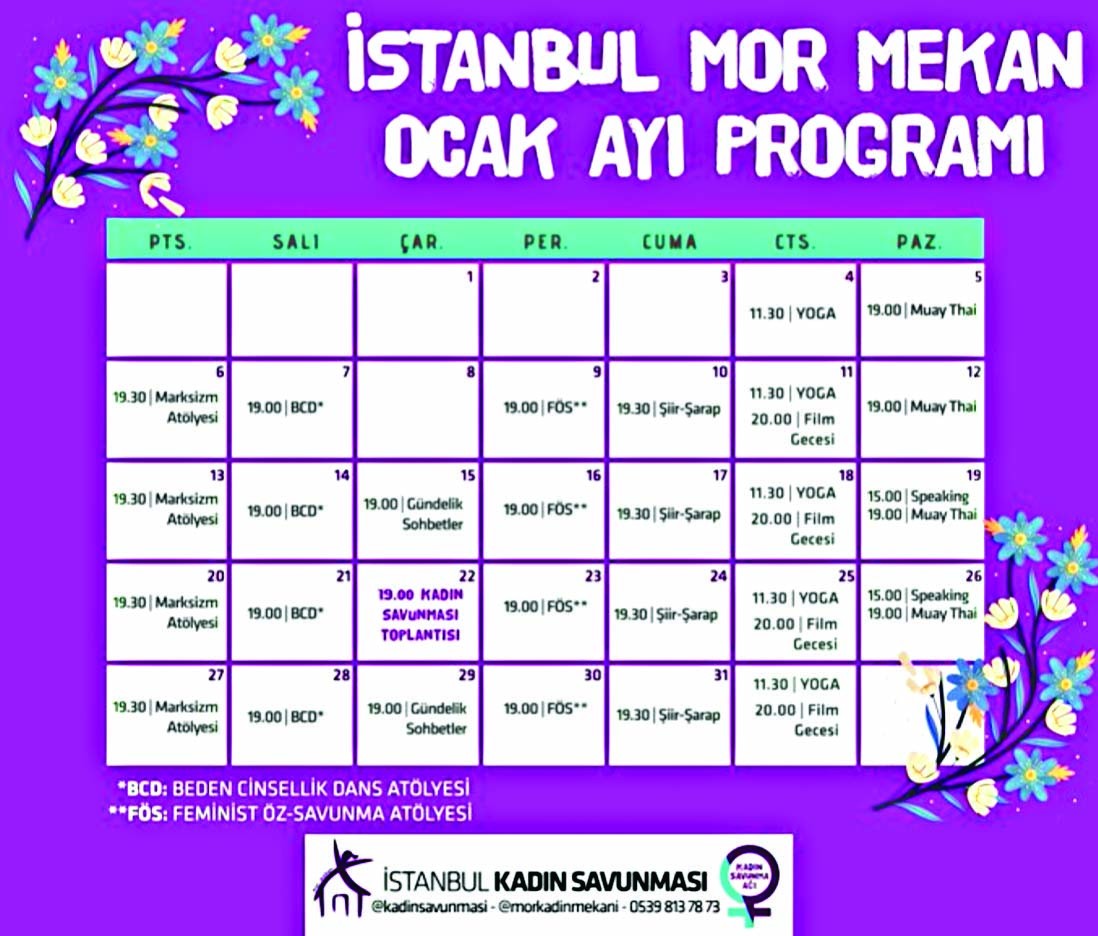 Mor Çatı bileşenlerinden İstanbul Kadın Savunması’nın düzenlediği “Mor Mekan” etkinliklerinin günlük işleyiş takvimine ulaşıldı. Haftanın her günü gerçekleştirilen Mor Çete etkinlikleri, feminazinin peşine taktığı kadınları şiddet sarmalına sürüklediğini gözler önüne serdi. Kadınlara yönelik haftalık çizelge oluşturan Mor Çete’nin “İstanbul Mor Mekan Ocak Programı”nda yer alan etkinlik takvimine göre her pazartesi Marksizm Atölyesi düzenleniyor. Mor Çete, Alman Yahudilerinden felsefeci Karl Marks’ın zehirli ideolojisi ile kadınların beynini yıkıyor.