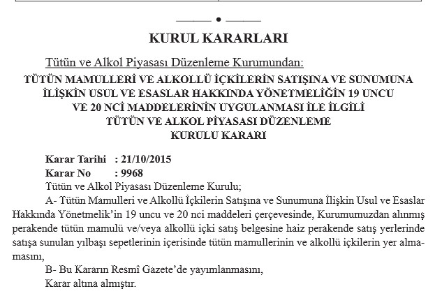 Tütün ve Alkol Piyasası Düzenleme Kurulu; A- Tütün Mamulleri ve Alkollü İçkilerin Satışına ve Sunumuna İlişkin Usul ve Esaslar Hakkında Yönetmelik’in 19 uncu ve 20 nci maddeleri çerçevesinde, Kurumumuzdan alınmış perakende tütün mamulü ve/veya alkollü içki satış belgesine haiz perakende satış yerlerinde satışa sunulan yılbaşı sepetlerinin içerisinde tütün mamullerinin ve alkollü içkilerin yer almamasını, B- Bu Kararın Resmî Gazete’de yayımlanmasını, Karar altına almıştır."