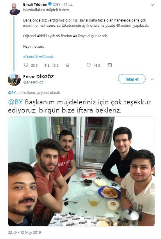Yıldırım'ın paylaşımının altına yorum yazan Twitter kullanıcısı gençler Yıldırım'a, akbil indirim sözü için teşekkür ederek, ''Birgün bize iftara bekleriz.'' davetinde bulundu.