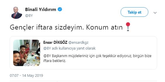 Bunun üzerine Yıldırım, davet paylaşımını alıntılayarak ''Gençler iftara sizdeyim. Konum atın'' dedi.