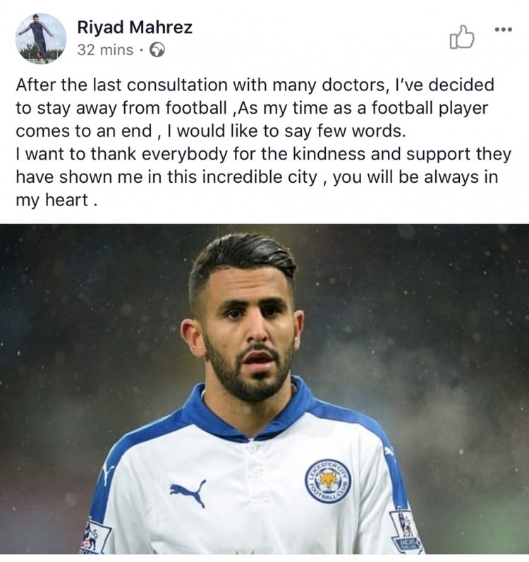 İngitere Premier Lig takımlarından Leicester City forması giyen yıldız futbolcu Riyad Mahrez, sosyal medya hesabından futbolu bıraktığını duyurdu.