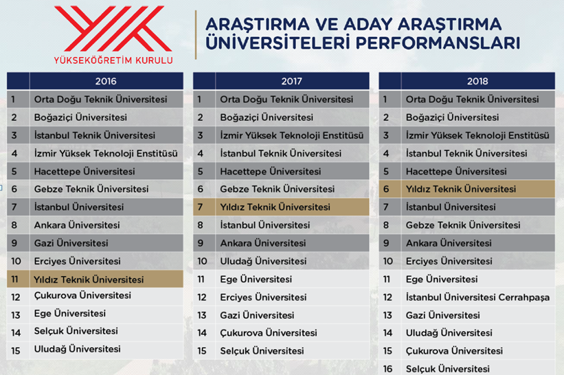 Bugüne kadar 100 binden fazla mezun veren 108 yıllık köklü eğitim kurumu Yıldız Teknik Üniversitesi, Araştırma ve aday araştırma üniversiteleri performansları sırlamasında her geçen yıl üst sıralara tırmanmaya devam ediyor. Araştırma ve aday araştırma üniversiteleri performansları sırlamasında 2016 yılında 11. sırada, 2017 yılında 7. sırada olan Yıldız Teknik Üniversitesi, 2018 yılında 5. sıraya yerleşti.
