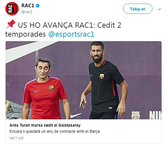 Barcelona merkezli Katalan RAC1 radyosunun haberine göre; Barcelona, Arda Turan'ın 2 yıllığına Galatasaray'a kiralanmasına evet dediğini açıkladı.