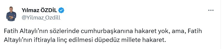 Yılmaz Özdil x hesabında bir paylaşım yaptı! Fatih Altaylı’nın sözlerinde cumhurbaşkanına hakaret yok, ama, Fatih Altaylı’nın iftirayla linç edilmesi düpedüz millete hakaret dedi!