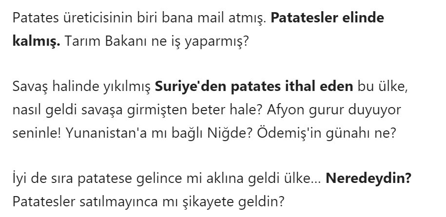 Savaş halinde yıkılmış Suriye'den patates ithal eden bu ülke, nasıl geldi savaşa girmişten beter hale? Afyon gurur duyuyor seninle! Yunanistan'a mı bağlı Niğde? Ödemiş'in günahı ne?