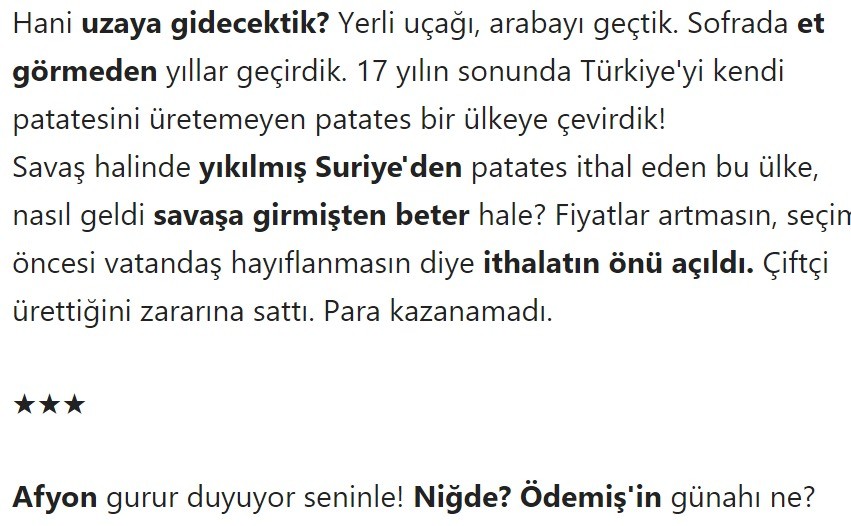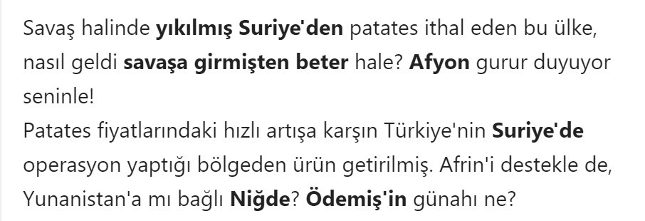 "Savaş halinde yıkılmış Suriye'den patates ithal eden bu ülke, nasıl geldi savaşa girmişten beter hale? Afyon gurur duyuyor seninle!
